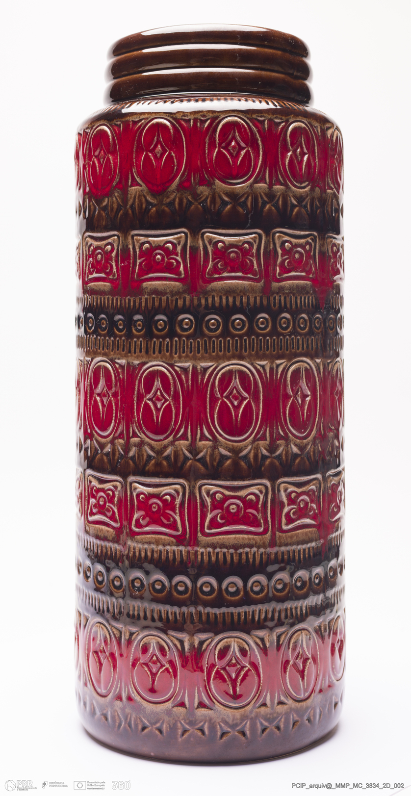 Matéria/Técnica: Barro branco rodado. Vidrado polícromo: castanho escuro e mel, vermelho; Cronologia: 1960-1970; Autoria: Desconhecido / Scheurich, Alemanha; Dimensões (cm): Altura: 41,5; Diâmetro: 16.