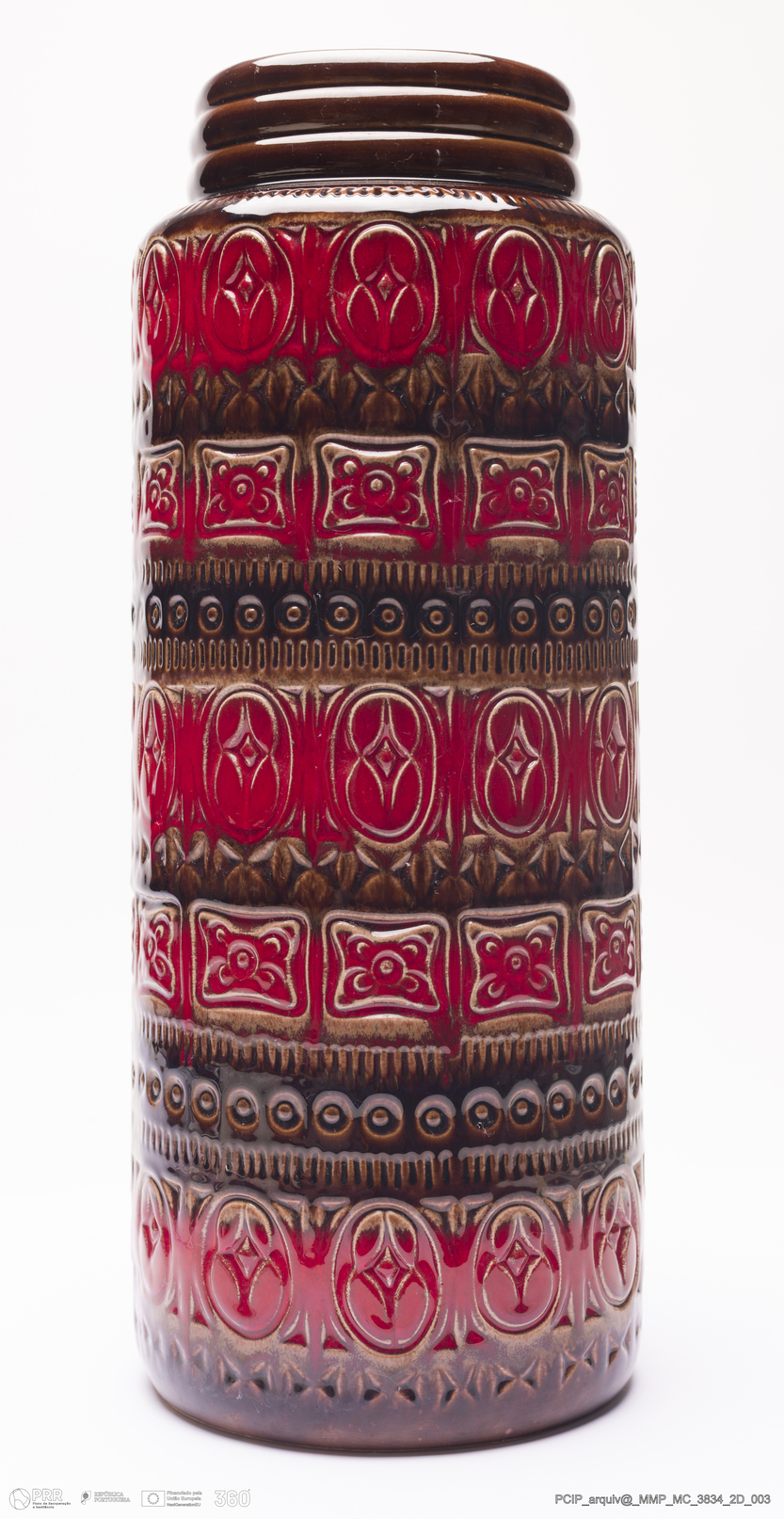 Matéria/Técnica: Barro branco rodado. Vidrado polícromo: castanho escuro e mel, vermelho; Cronologia: 1960-1970; Autoria: Desconhecido / Scheurich, Alemanha; Dimensões (cm): Altura: 41,5; Diâmetro: 16.