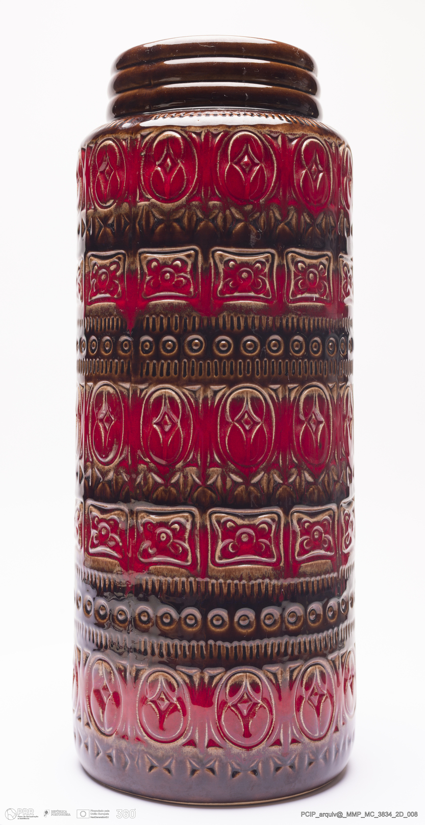 Matéria/Técnica: Barro branco rodado. Vidrado polícromo: castanho escuro e mel, vermelho; Cronologia: 1960-1970; Autoria: Desconhecido / Scheurich, Alemanha; Dimensões (cm): Altura: 41,5; Diâmetro: 16.