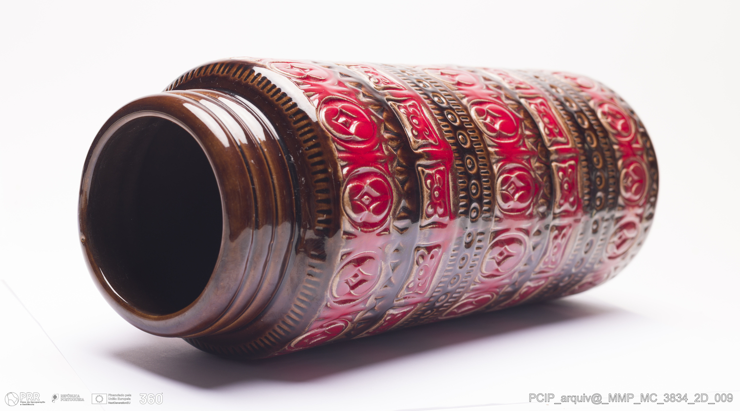 Matéria/Técnica: Barro branco rodado. Vidrado polícromo: castanho escuro e mel, vermelho; Cronologia: 1960-1970; Autoria: Desconhecido / Scheurich, Alemanha; Dimensões (cm): Altura: 41,5; Diâmetro: 16.