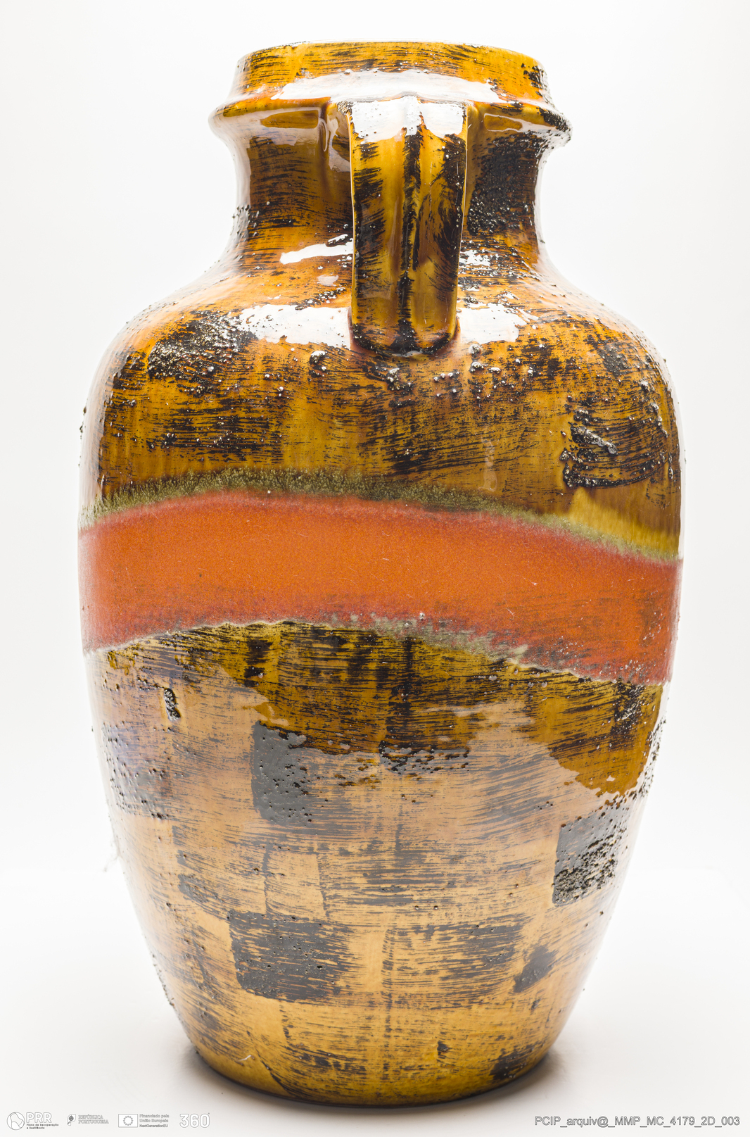 Matéria/Técnica: Barro vermelho moldado. Vidrado polícromo: laranja, castanho escuro e mel; Cronologia: 1945-1984; Autoria: Desconhecido / Carstens / Alemanha; Dimensões (cm): Altura: 51; Diâmetro: 30.