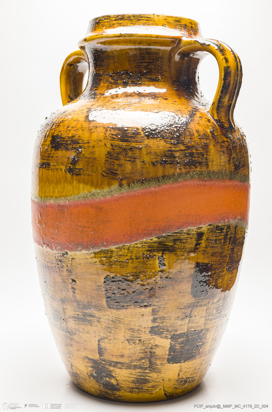 Matéria/Técnica: Barro vermelho moldado. Vidrado polícromo: laranja, castanho escuro e mel; Cronologia: 1945-1984; Autoria: Desconhecido / Carstens / Alemanha; Dimensões (cm): Altura: 51; Diâmetro: 30.