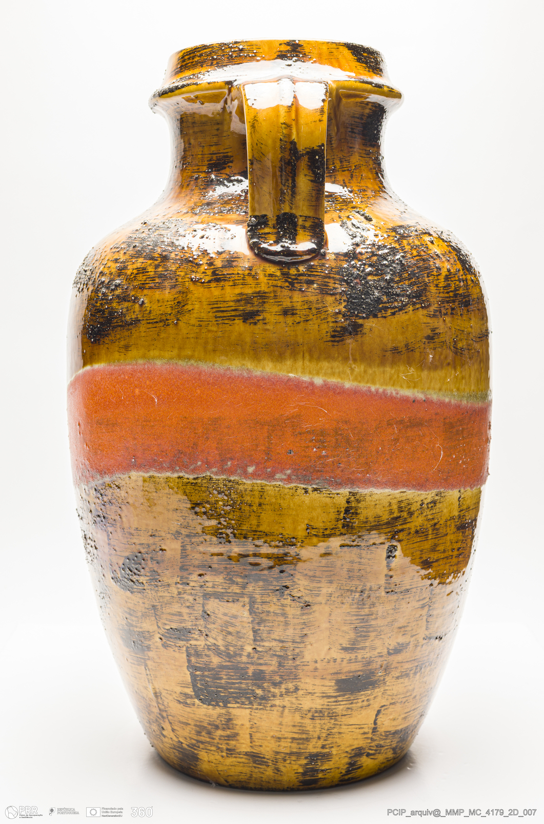 Matéria/Técnica: Barro vermelho moldado. Vidrado polícromo: laranja, castanho escuro e mel; Cronologia: 1945-1984; Autoria: Desconhecido / Carstens / Alemanha; Dimensões (cm): Altura: 51; Diâmetro: 30.