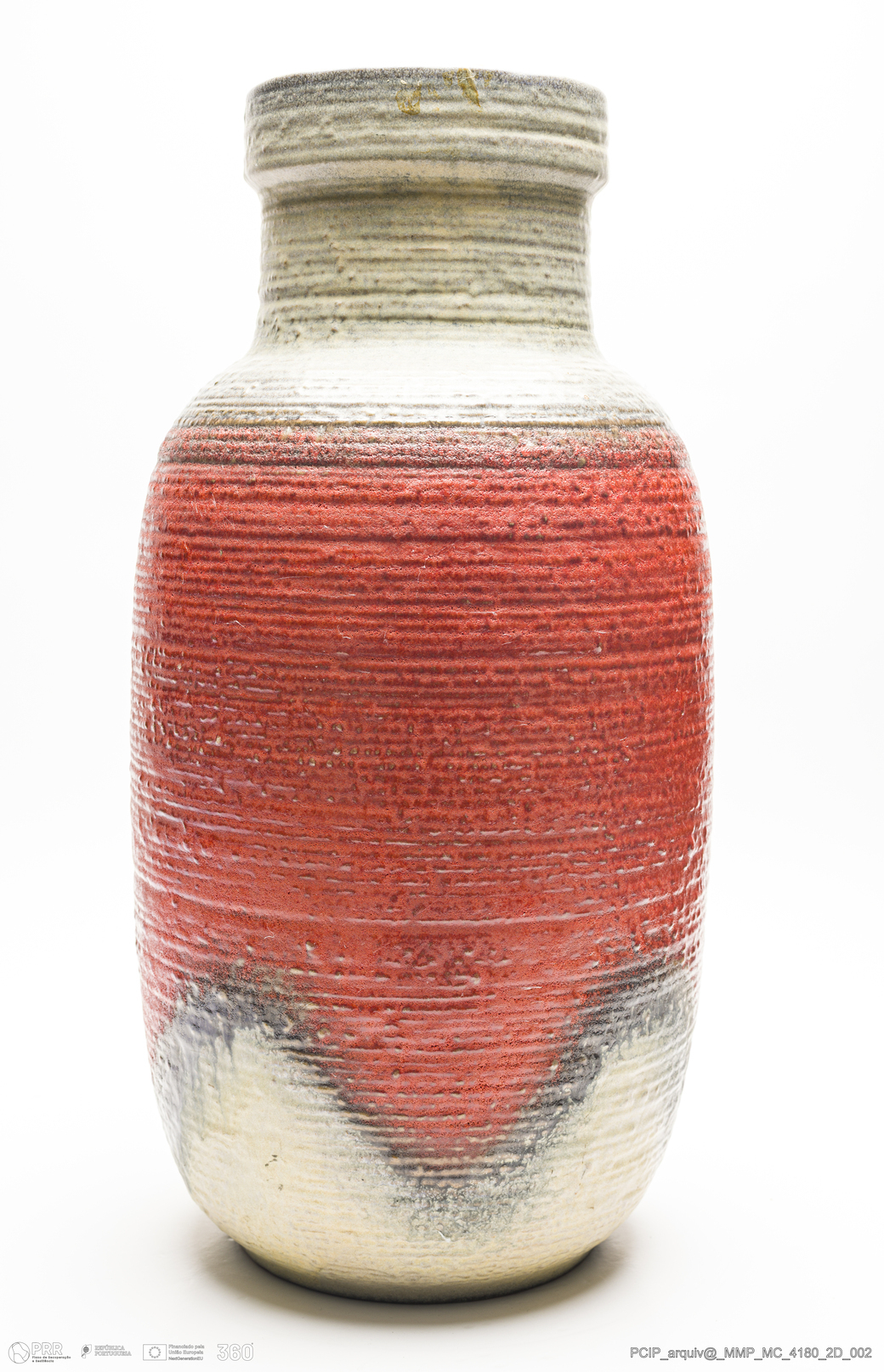 Matéria/Técnica: Barro vermelho rodado. Vidrado polícromo: preto, cinzento, vermelho e camurça; Cronologia: 1945-1984; Autoria: Desconhecido / Carstens / Alemanha; Dimensões (cm): Altura: 51; Diâmetro: 24.