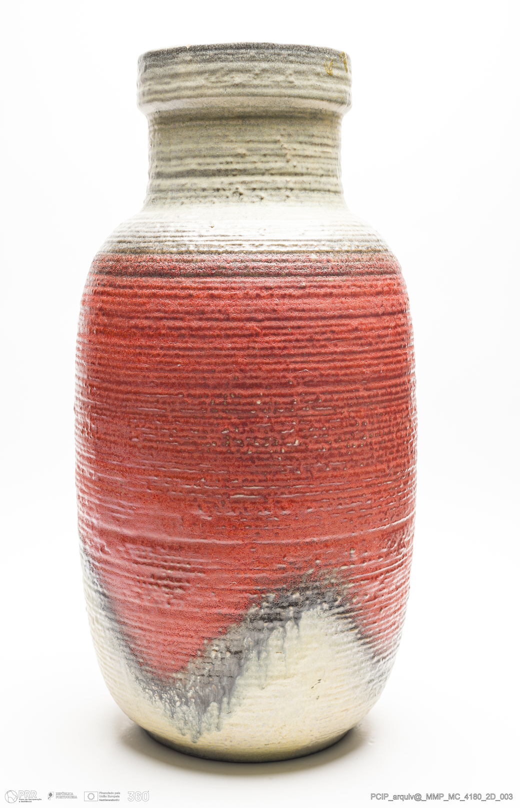 Matéria/Técnica: Barro vermelho rodado. Vidrado polícromo: preto, cinzento, vermelho e camurça; Cronologia: 1945-1984; Autoria: Desconhecido / Carstens / Alemanha; Dimensões (cm): Altura: 51; Diâmetro: 24.