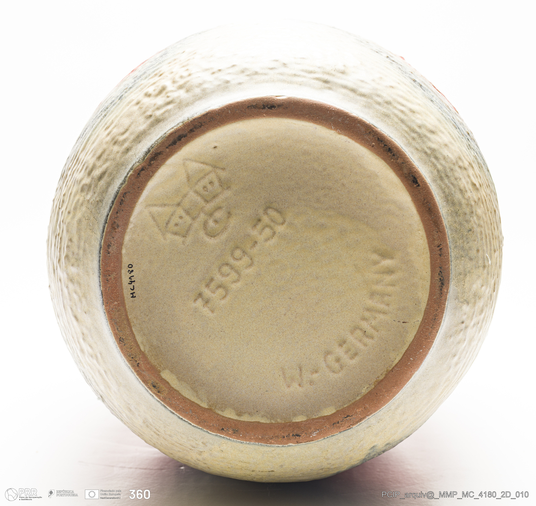 Matéria/Técnica: Barro vermelho rodado. Vidrado polícromo: preto, cinzento, vermelho e camurça; Cronologia: 1945-1984; Autoria: Desconhecido / Carstens / Alemanha; Dimensões (cm): Altura: 51; Diâmetro: 24.