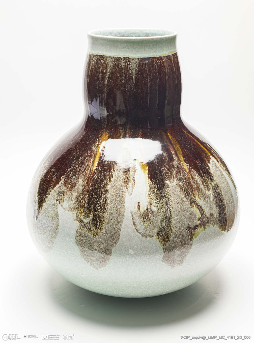 Matéria/Técnica: Barro vermelho rodado. Vidrado polícromo: castanho e verde; Cronologia: século XX; Autoria: Desconhecido / Itália; Dimensões (cm): Altura: 38,5; Diâmetro: 31,5.