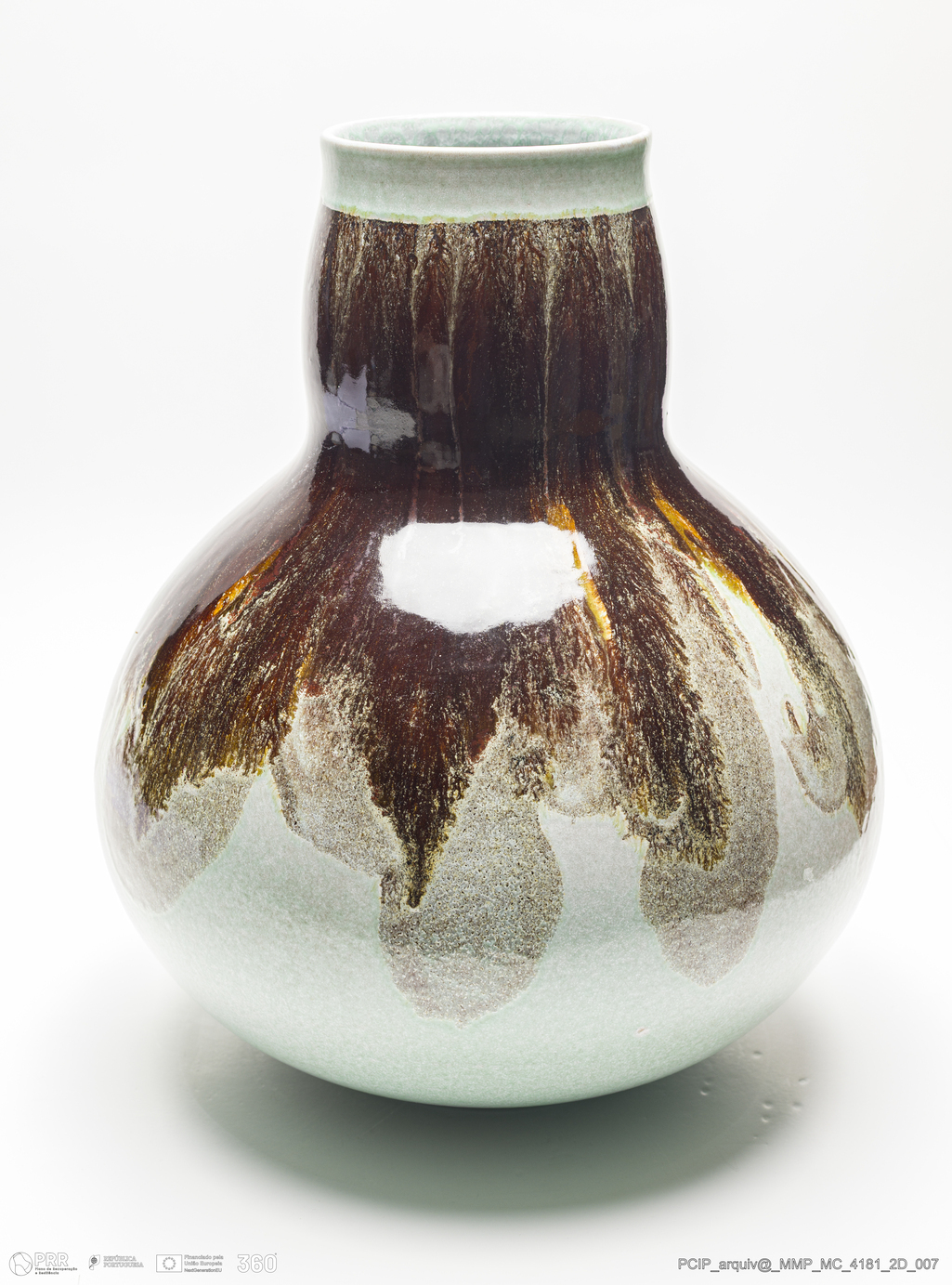 Matéria/Técnica: Barro vermelho rodado. Vidrado polícromo: castanho e verde; Cronologia: século XX; Autoria: Desconhecido / Itália; Dimensões (cm): Altura: 38,5; Diâmetro: 31,5.