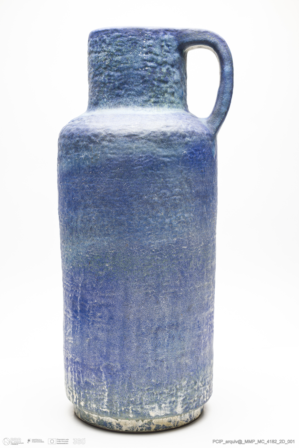Matéria/Técnica: Barro vermelho rodado. Vidrado polícromo: azul e verde; Cronologia: 1901; Autoria: Desconhecido / Karlsruhe, Alemanha; Dimensões (cm): Altura: 49; Largura: 20; Comprimento: 23.