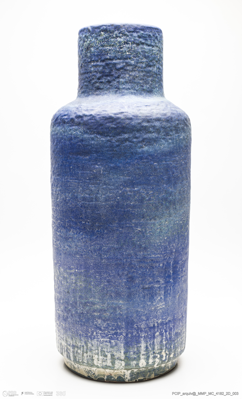 Matéria/Técnica: Barro vermelho rodado. Vidrado polícromo: azul e verde; Cronologia: 1901; Autoria: Desconhecido / Karlsruhe, Alemanha; Dimensões (cm): Altura: 49; Largura: 20; Comprimento: 23.