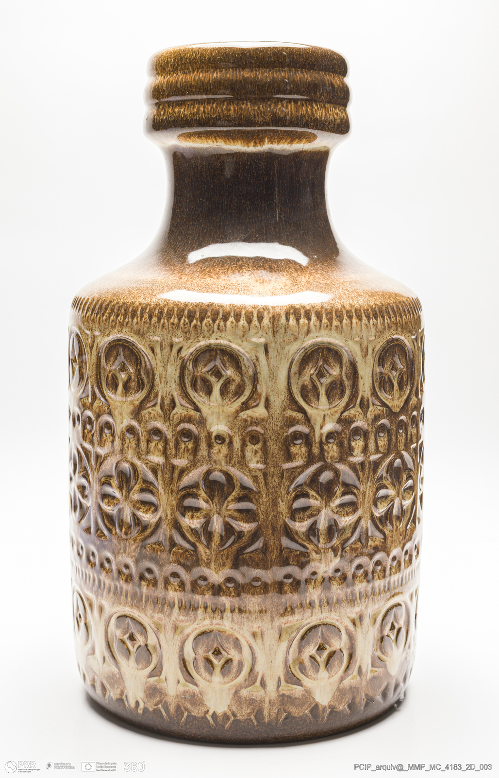 Matéria/Técnica: Barro vermelho moldado. Vidrado polícromo: castanho escuro e mel; Cronologia: 1933-1978; Autoria: Desconhecido / Bay Keramik, Alemanha; Dimensões (cm): Altura: 38,5; Largura: 21; Comprimento: 25,5.