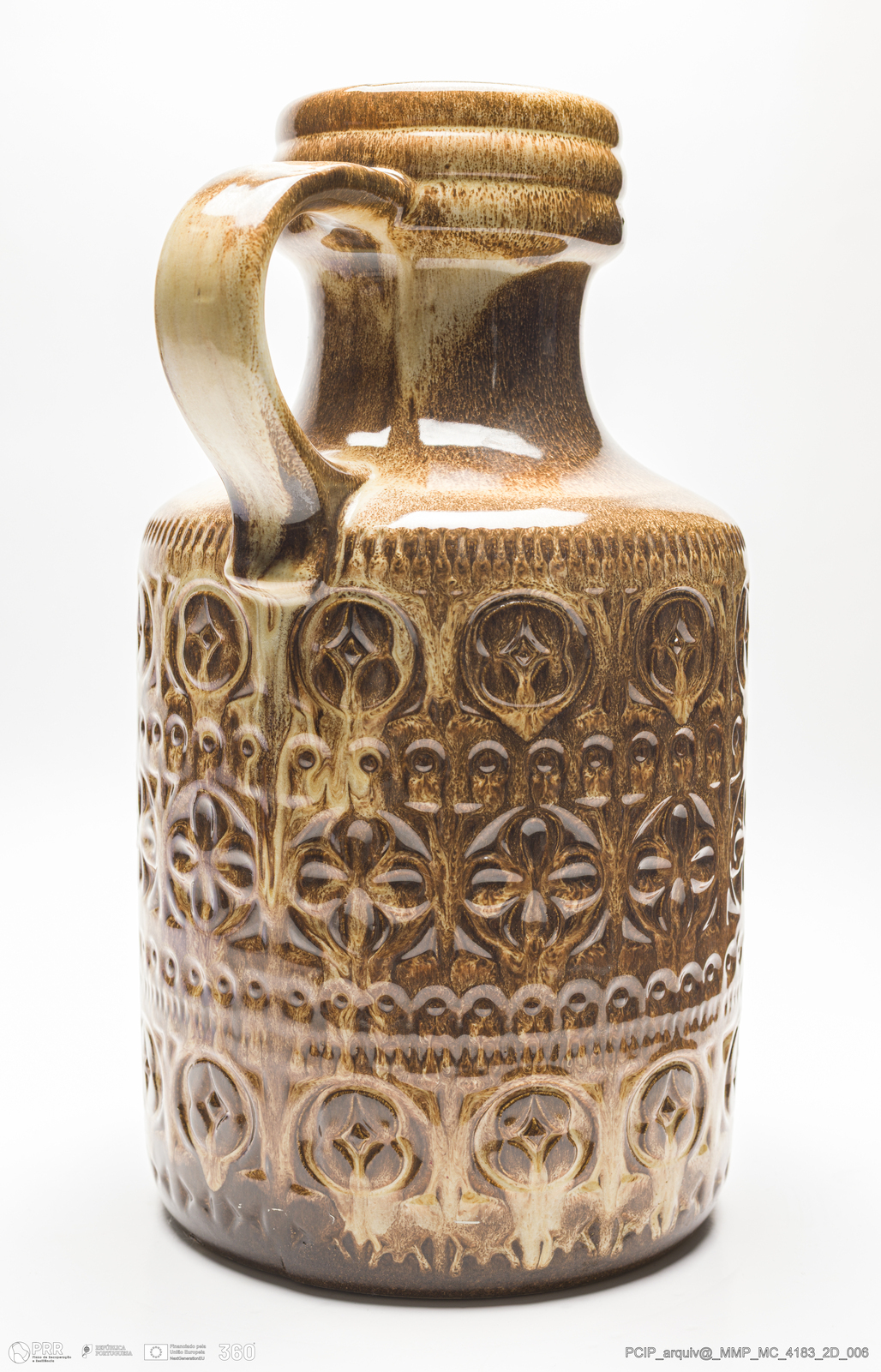 Matéria/Técnica: Barro vermelho moldado. Vidrado polícromo: castanho escuro e mel; Cronologia: 1933-1978; Autoria: Desconhecido / Bay Keramik, Alemanha; Dimensões (cm): Altura: 38,5; Largura: 21; Comprimento: 25,5.