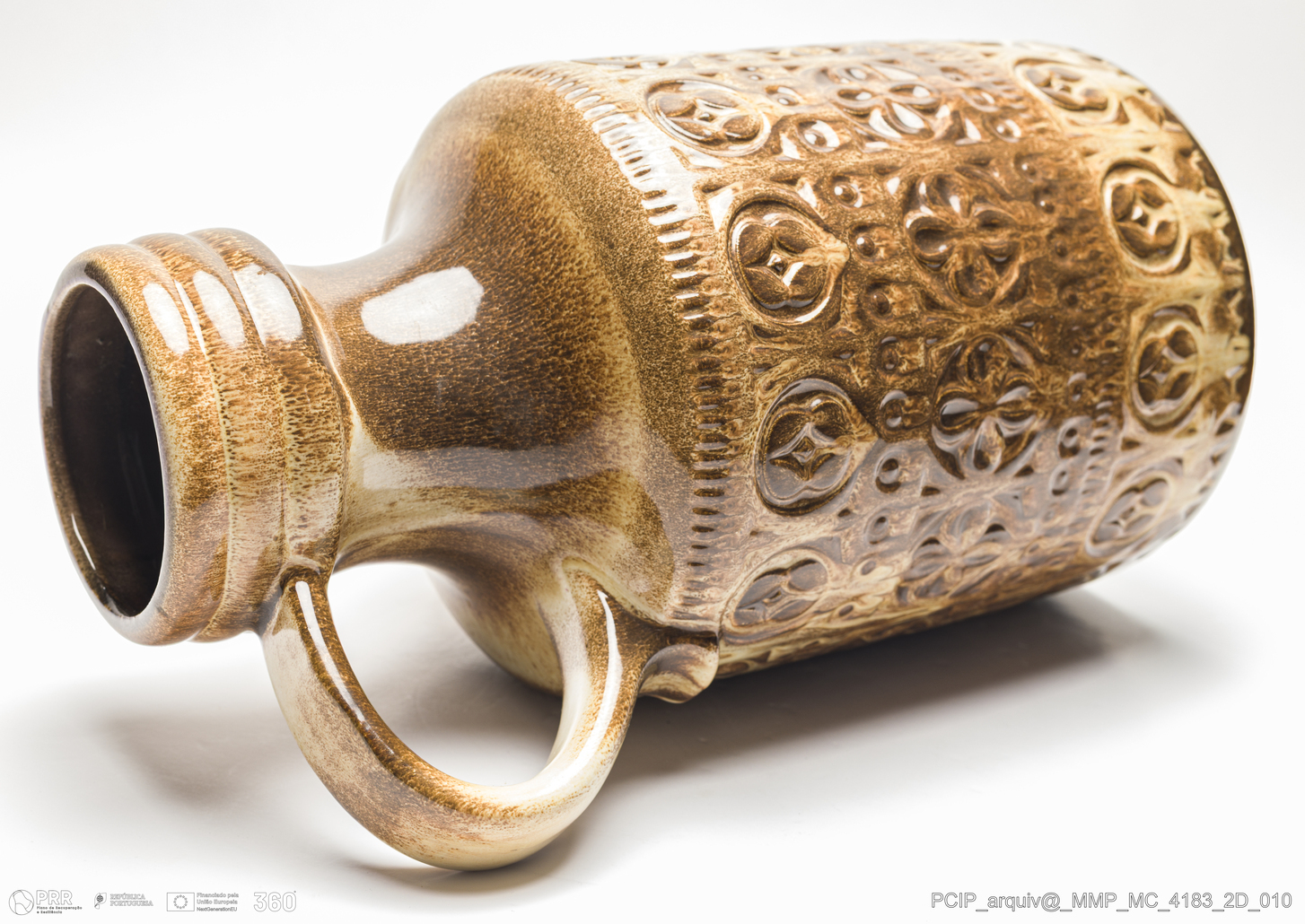 Matéria/Técnica: Barro vermelho moldado. Vidrado polícromo: castanho escuro e mel; Cronologia: 1933-1978; Autoria: Desconhecido / Bay Keramik, Alemanha; Dimensões (cm): Altura: 38,5; Largura: 21; Comprimento: 25,5.