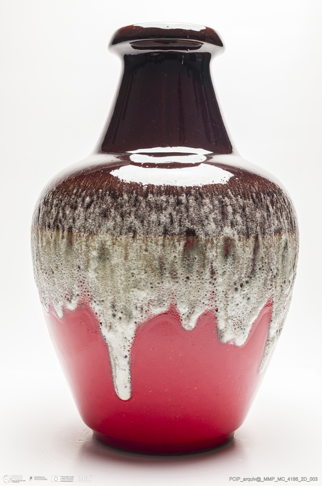 Matéria/Técnica: Barro branco moldado. Vidrado polícromo: castanho, vermelho e branco; Cronologia: 1933-1978; Autoria: Desconhecido / Bay Keramik, Alemanha; Dimensões (cm): Altura: 46; Diâmetro: 28,5.