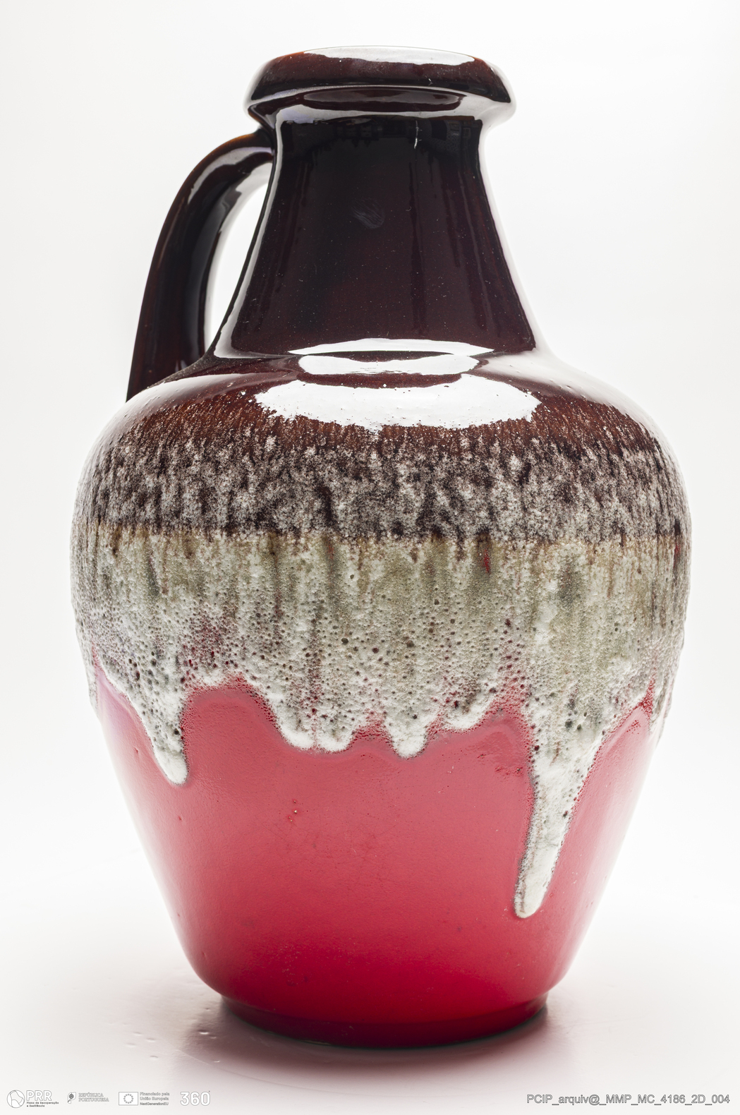 Matéria/Técnica: Barro branco moldado. Vidrado polícromo: castanho, vermelho e branco; Cronologia: 1933-1978; Autoria: Desconhecido / Bay Keramik, Alemanha; Dimensões (cm): Altura: 46; Diâmetro: 28,5.