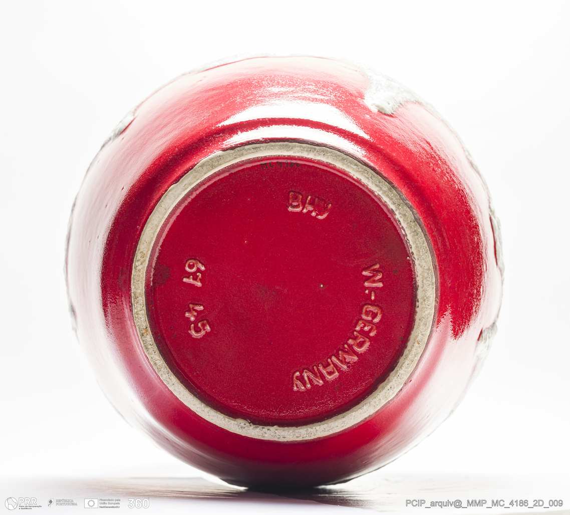 Matéria/Técnica: Barro branco moldado. Vidrado polícromo: castanho, vermelho e branco; Cronologia: 1933-1978; Autoria: Desconhecido / Bay Keramik, Alemanha; Dimensões (cm): Altura: 46; Diâmetro: 28,5.