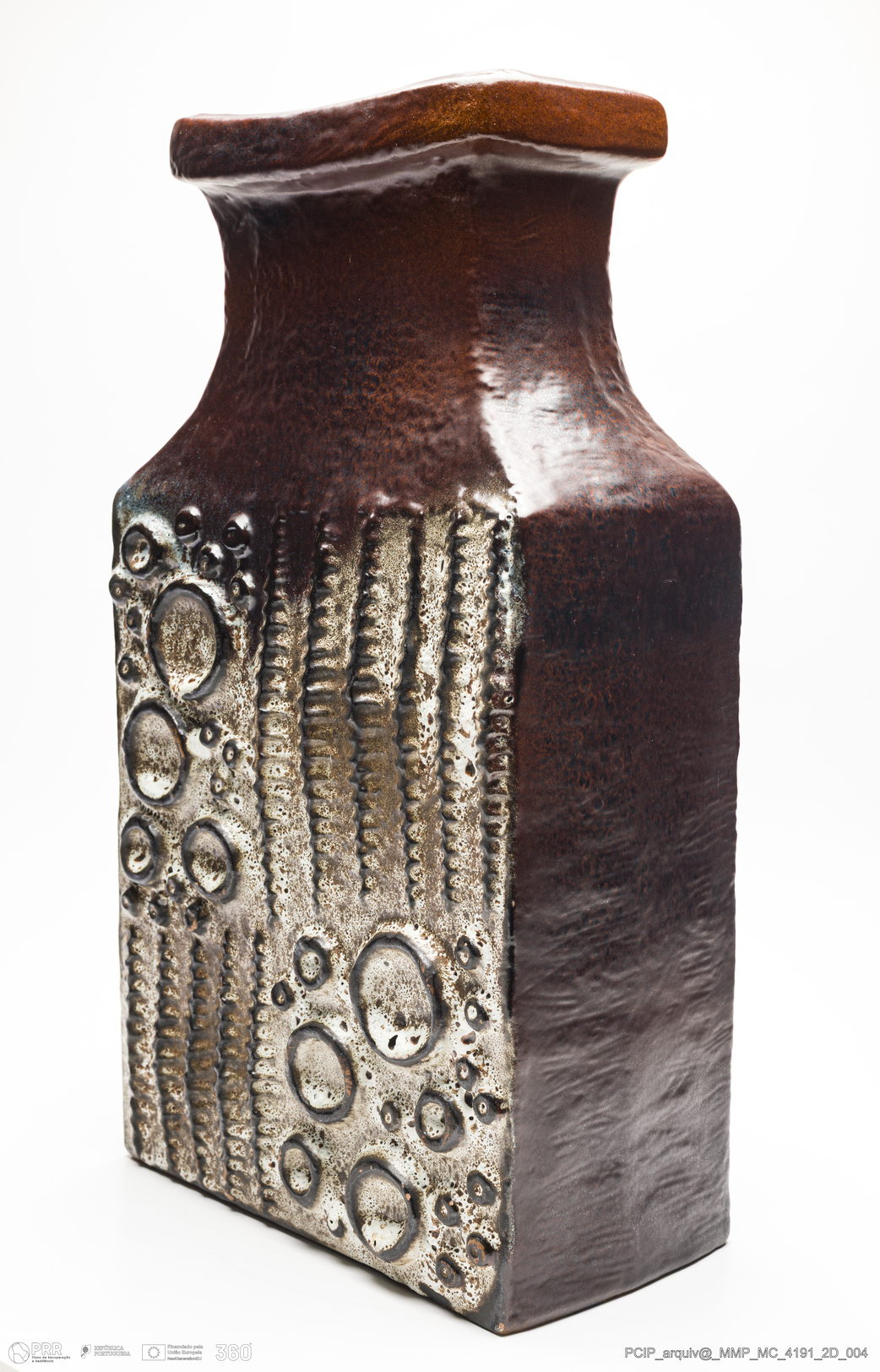 Matéria/Técnica: Barro vermelho moldado. Vidrado polícromo: castanho e pérola; Cronologia: 1945-1984; Autoria: Desconhecido / Carstens / Alemanha; Dimensões (cm): Altura: 50; Largura: 15; Comprimento: 27,5.