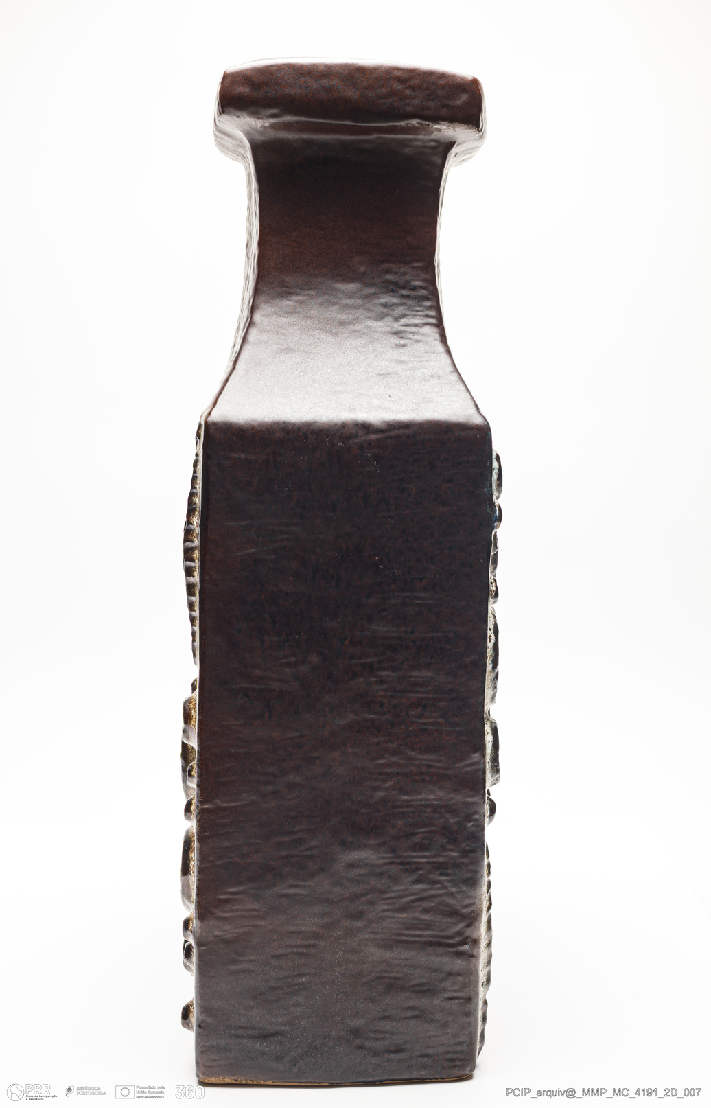 Matéria/Técnica: Barro vermelho moldado. Vidrado polícromo: castanho e pérola; Cronologia: 1945-1984; Autoria: Desconhecido / Carstens / Alemanha; Dimensões (cm): Altura: 50; Largura: 15; Comprimento: 27,5.