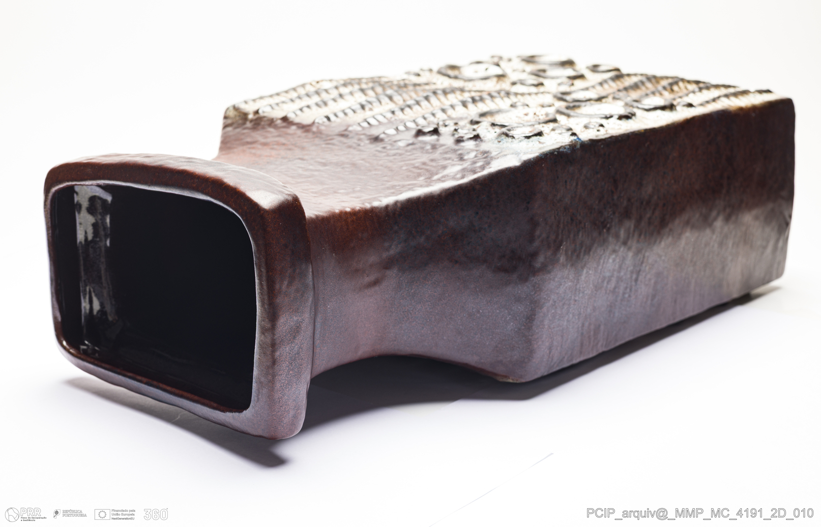 Matéria/Técnica: Barro vermelho moldado. Vidrado polícromo: castanho e pérola; Cronologia: 1945-1984; Autoria: Desconhecido / Carstens / Alemanha; Dimensões (cm): Altura: 50; Largura: 15; Comprimento: 27,5.