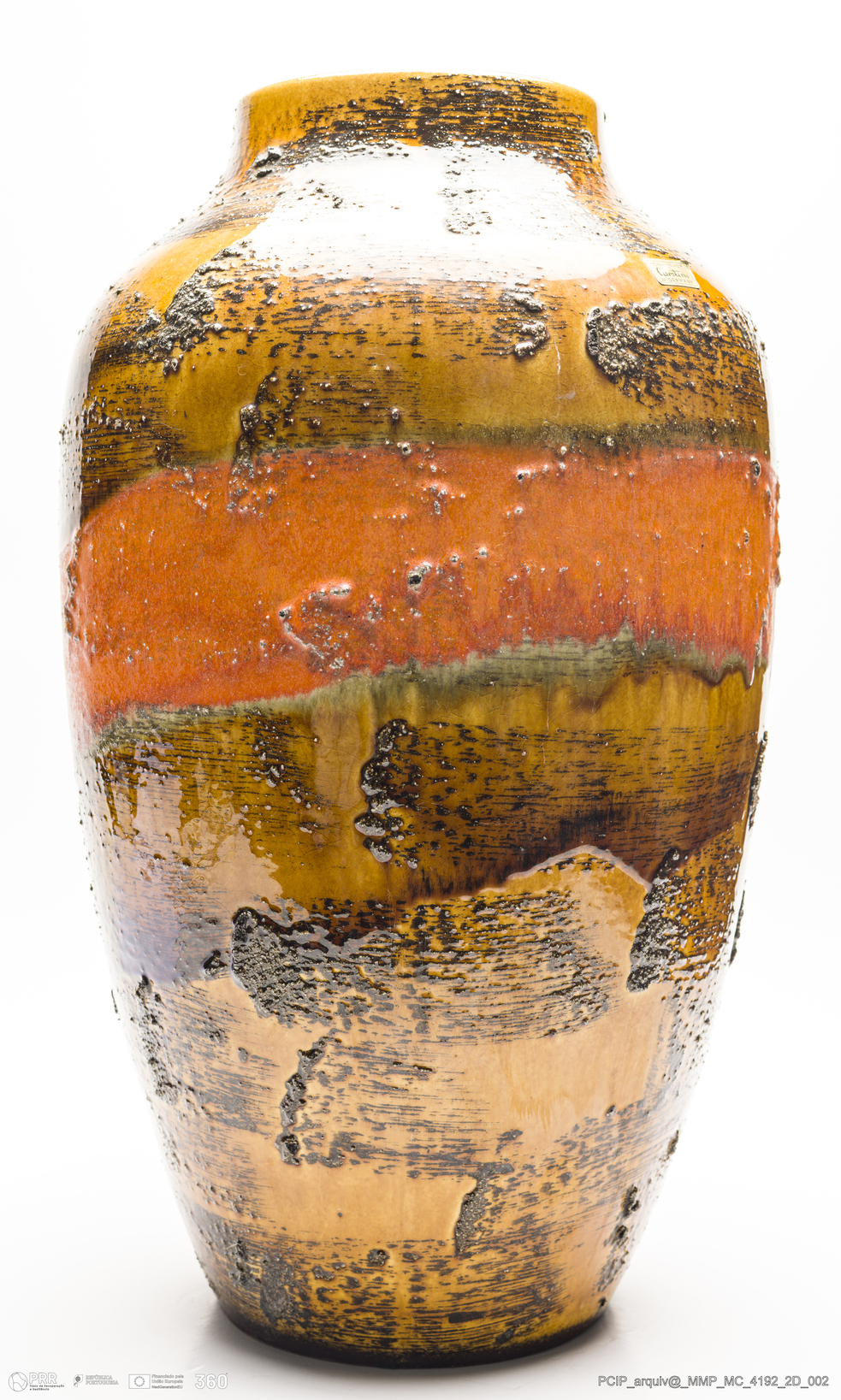 Matéria/Técnica: Barro vermelho moldado. Vidrado polícromo: laranja, castanho escuro e mel; Cronologia: 1945-1984; Autoria: Desconhecido / Carstens / Alemanha; Dimensões (cm): Altura: 51; Diâmetro: 29,5.