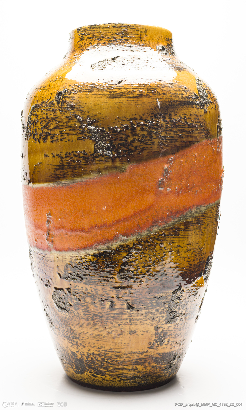 Matéria/Técnica: Barro vermelho moldado. Vidrado polícromo: laranja, castanho escuro e mel; Cronologia: 1945-1984; Autoria: Desconhecido / Carstens / Alemanha; Dimensões (cm): Altura: 51; Diâmetro: 29,5.