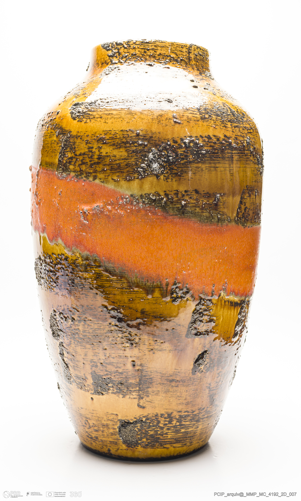 Matéria/Técnica: Barro vermelho moldado. Vidrado polícromo: laranja, castanho escuro e mel; Cronologia: 1945-1984; Autoria: Desconhecido / Carstens / Alemanha; Dimensões (cm): Altura: 51; Diâmetro: 29,5.