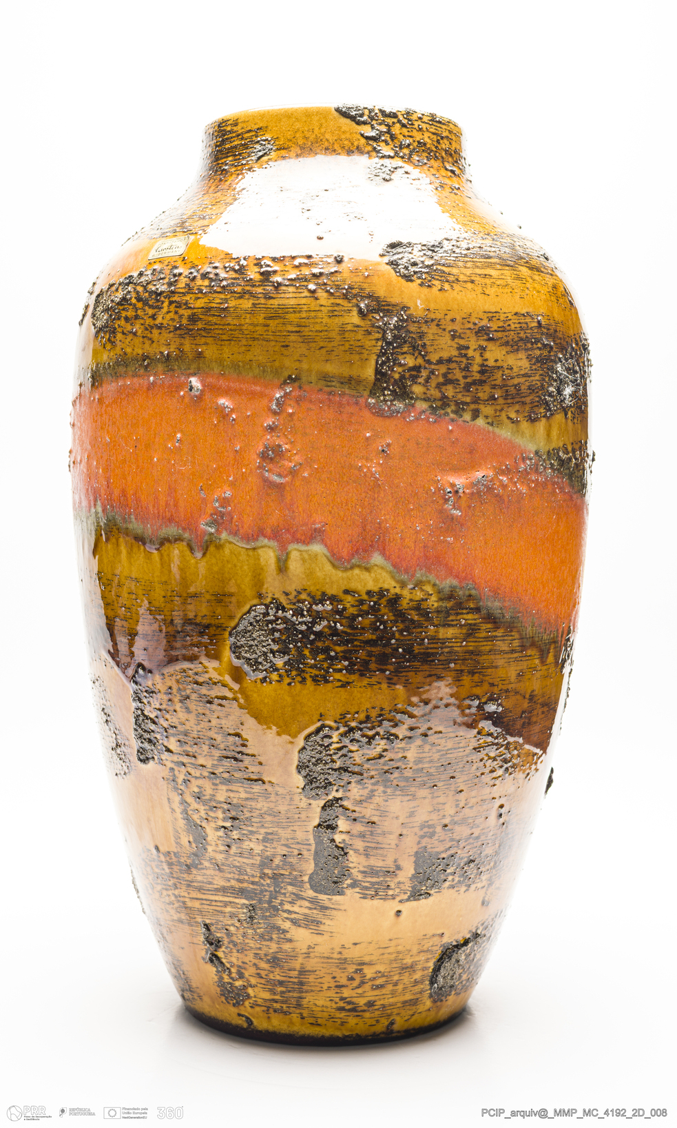 Matéria/Técnica: Barro vermelho moldado. Vidrado polícromo: laranja, castanho escuro e mel; Cronologia: 1945-1984; Autoria: Desconhecido / Carstens / Alemanha; Dimensões (cm): Altura: 51; Diâmetro: 29,5.