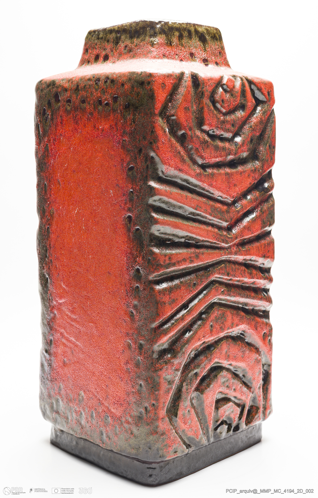 Matéria/Técnica: Barro vermelho moldado. Vidrado polícromo: castanho, verde e vermelho; Cronologia: 1945-1984; Autoria: Desconhecido / Carstens / Alemanha; Dimensões (cm): Altura: 50; Largura: 21,5; Comprimento: 22.