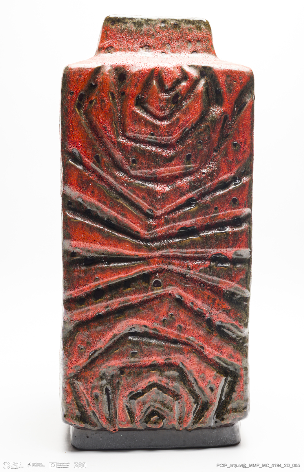 Matéria/Técnica: Barro vermelho moldado. Vidrado polícromo: castanho, verde e vermelho; Cronologia: 1945-1984; Autoria: Desconhecido / Carstens / Alemanha; Dimensões (cm): Altura: 50; Largura: 21,5; Comprimento: 22.