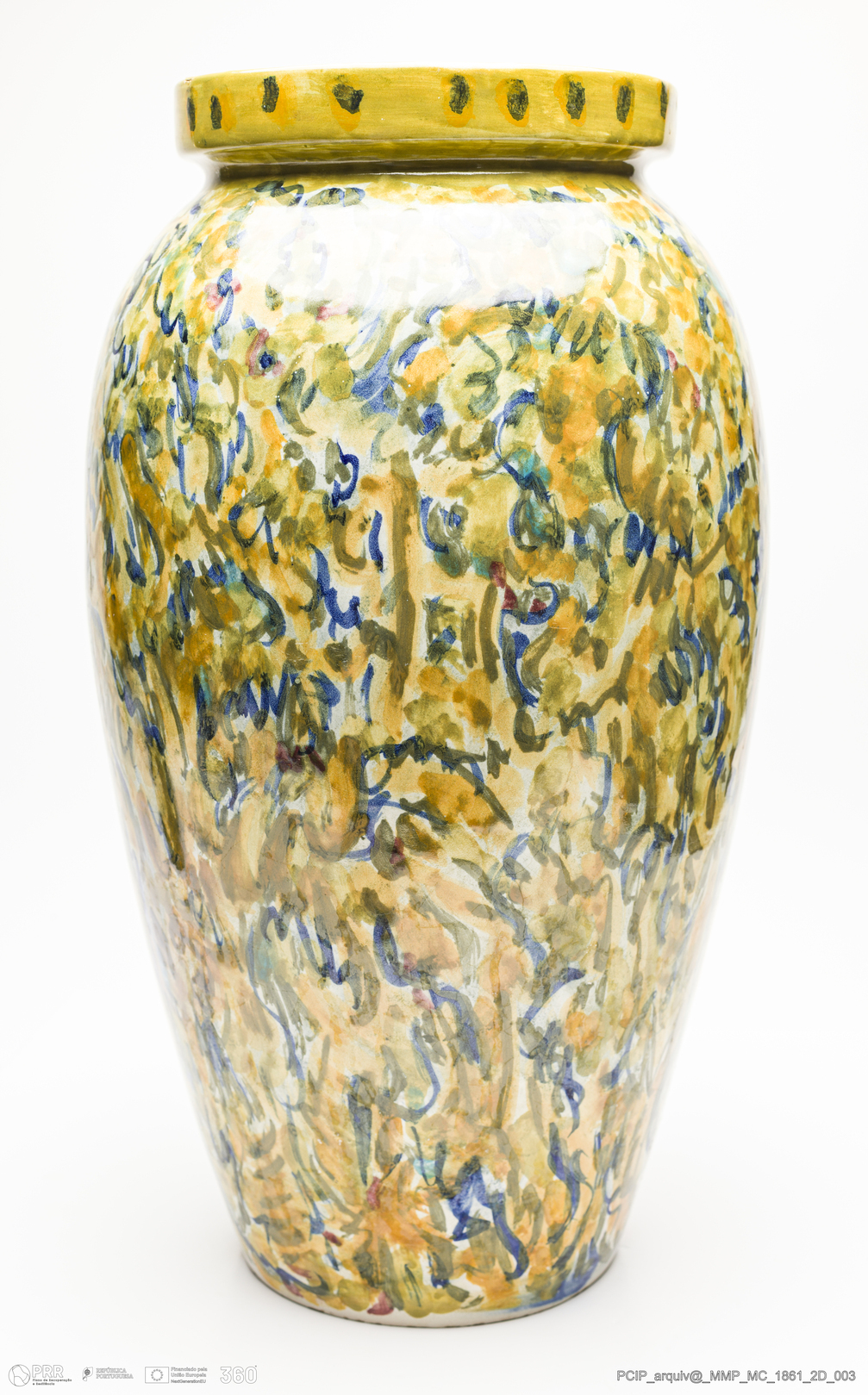 Matéria/Técnica: Barro branco rodado. Vidrado polícromo com escorridos: amarelo, castanho, azul e verde; Cronologia: 1960; Autoria: Manuel Alves Cargaleiro / Fábrica Cerâmica Viúva Lamego, Lisboa; Dimensões (cm): Altura: 50; Diâmetro: 25.