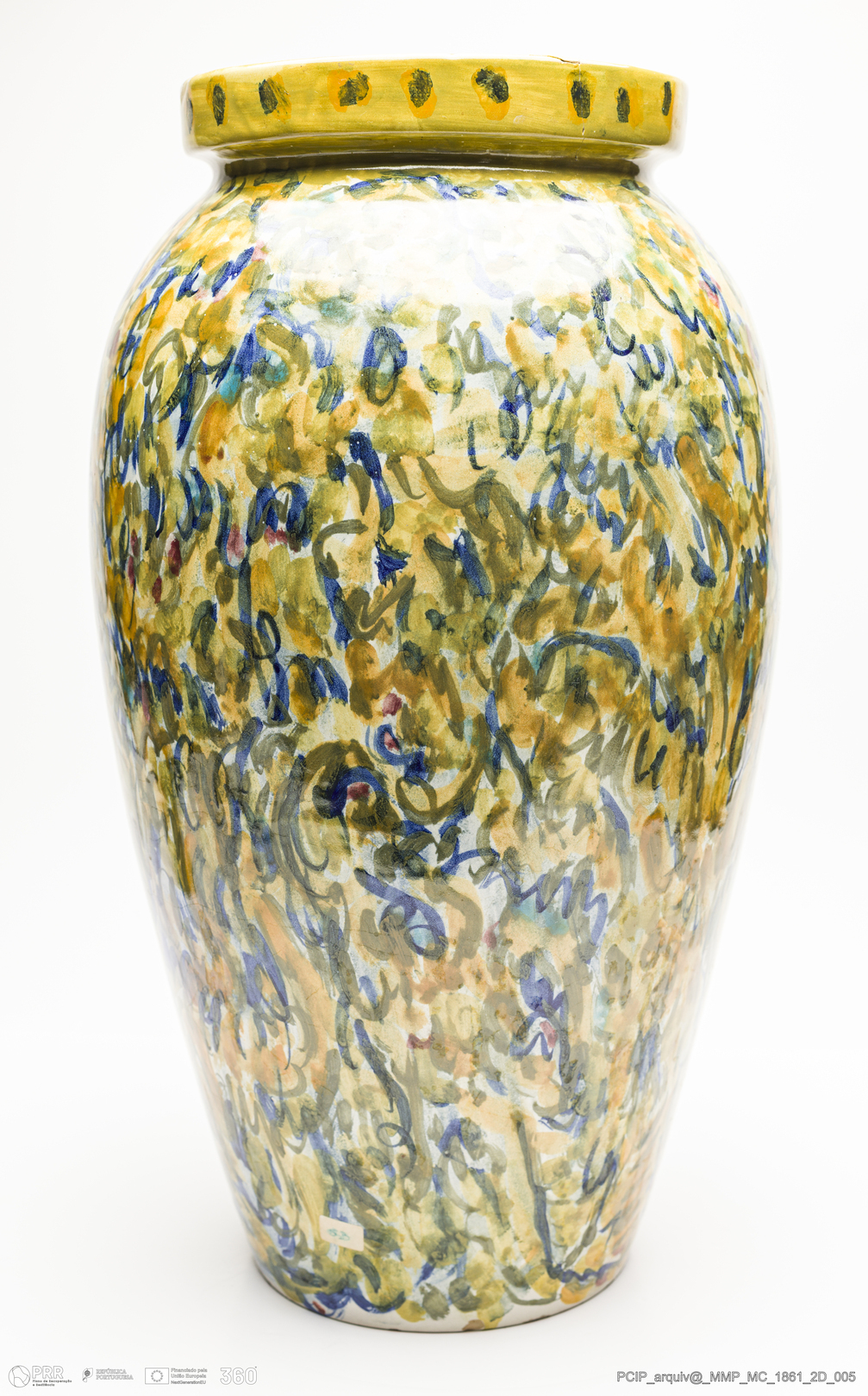 Matéria/Técnica: Barro branco rodado. Vidrado polícromo com escorridos: amarelo, castanho, azul e verde; Cronologia: 1960; Autoria: Manuel Alves Cargaleiro / Fábrica Cerâmica Viúva Lamego, Lisboa; Dimensões (cm): Altura: 50; Diâmetro: 25.