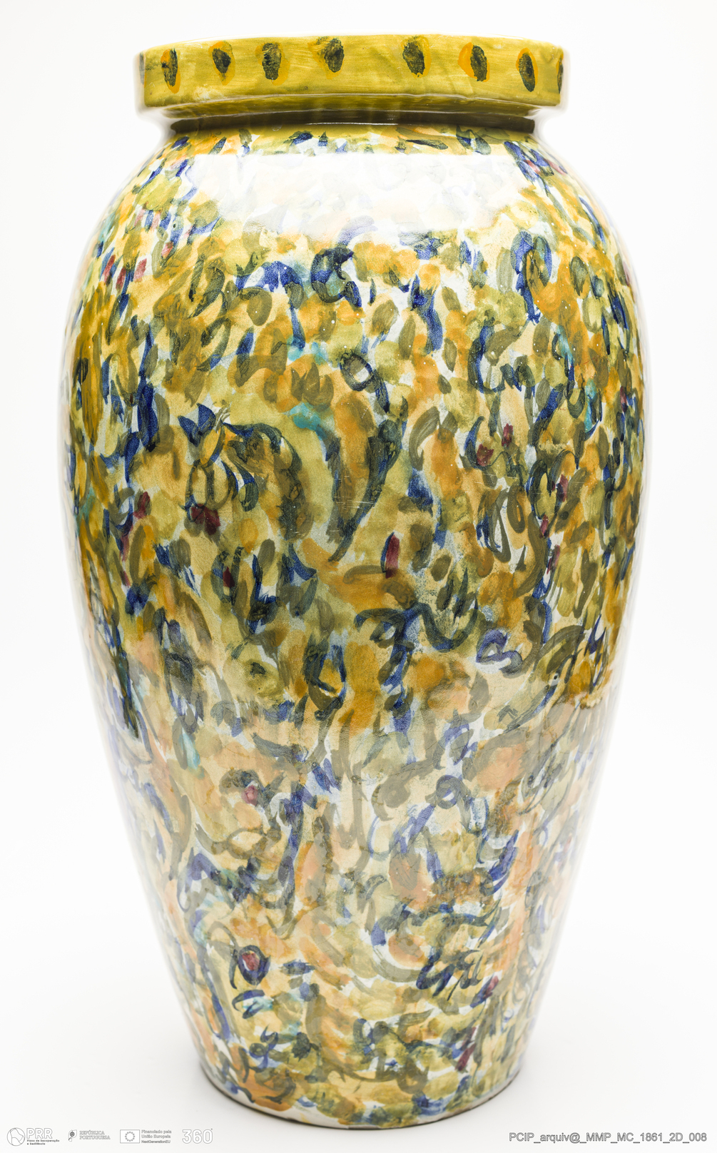 Matéria/Técnica: Barro branco rodado. Vidrado polícromo com escorridos: amarelo, castanho, azul e verde; Cronologia: 1960; Autoria: Manuel Alves Cargaleiro / Fábrica Cerâmica Viúva Lamego, Lisboa; Dimensões (cm): Altura: 50; Diâmetro: 25.