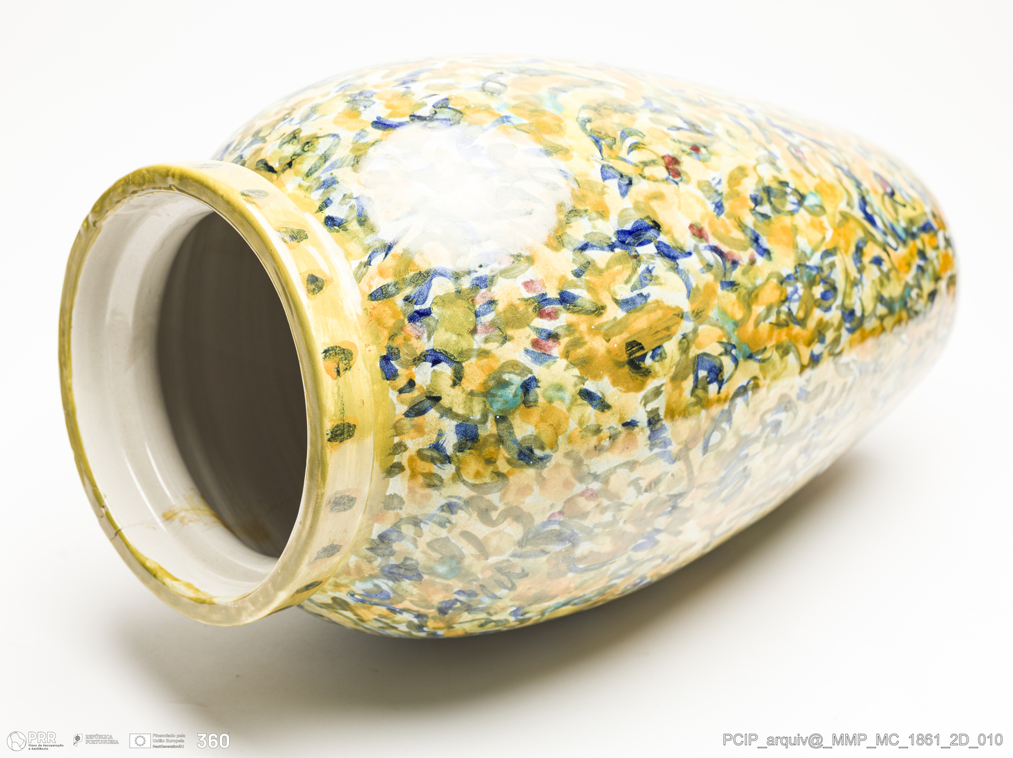 Matéria/Técnica: Barro branco rodado. Vidrado polícromo com escorridos: amarelo, castanho, azul e verde; Cronologia: 1960; Autoria: Manuel Alves Cargaleiro / Fábrica Cerâmica Viúva Lamego, Lisboa; Dimensões (cm): Altura: 50; Diâmetro: 25.