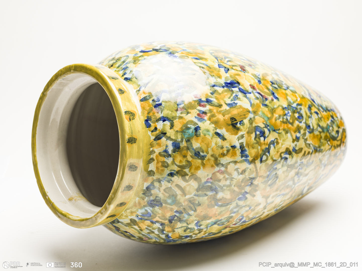 Matéria/Técnica: Barro branco rodado. Vidrado polícromo com escorridos: amarelo, castanho, azul e verde; Cronologia: 1960; Autoria: Manuel Alves Cargaleiro / Fábrica Cerâmica Viúva Lamego, Lisboa; Dimensões (cm): Altura: 50; Diâmetro: 25.