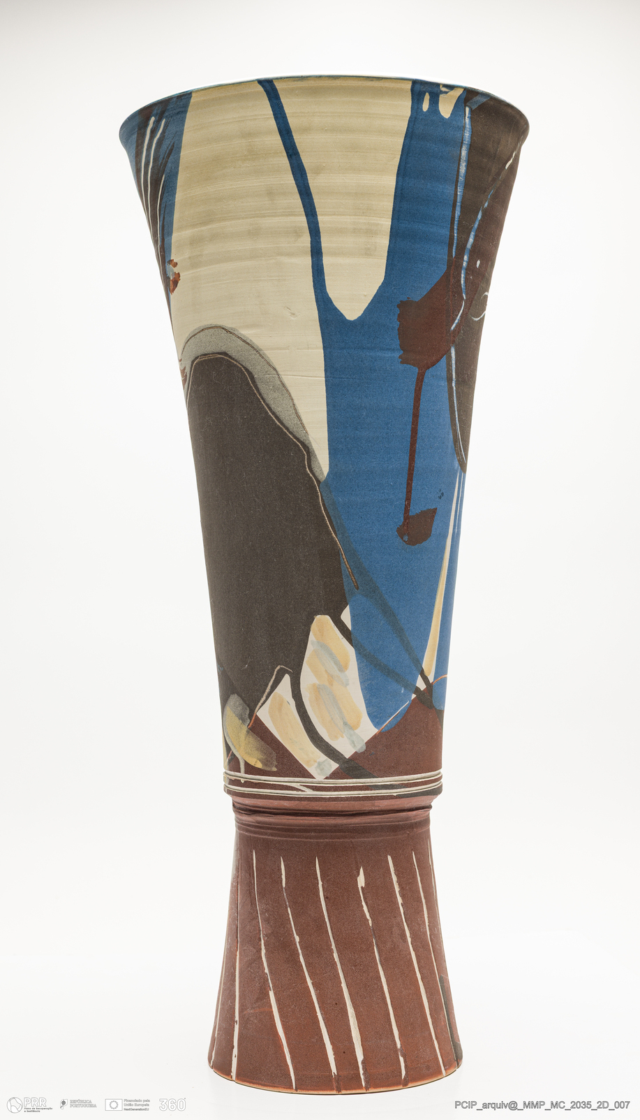 Matéria/Técnica: Barbotina rodada e moldada. Vidrado azul, branco, castanho e preto. Camurça no interior; Cronologia: 1988; Autoria: Eduardo Constantino / Atelier de Ceramique de Eduardo Constantino, Quimperlè, Bretanha, França; Dimensões (cm): Altura: 585; Diâmetro:26.