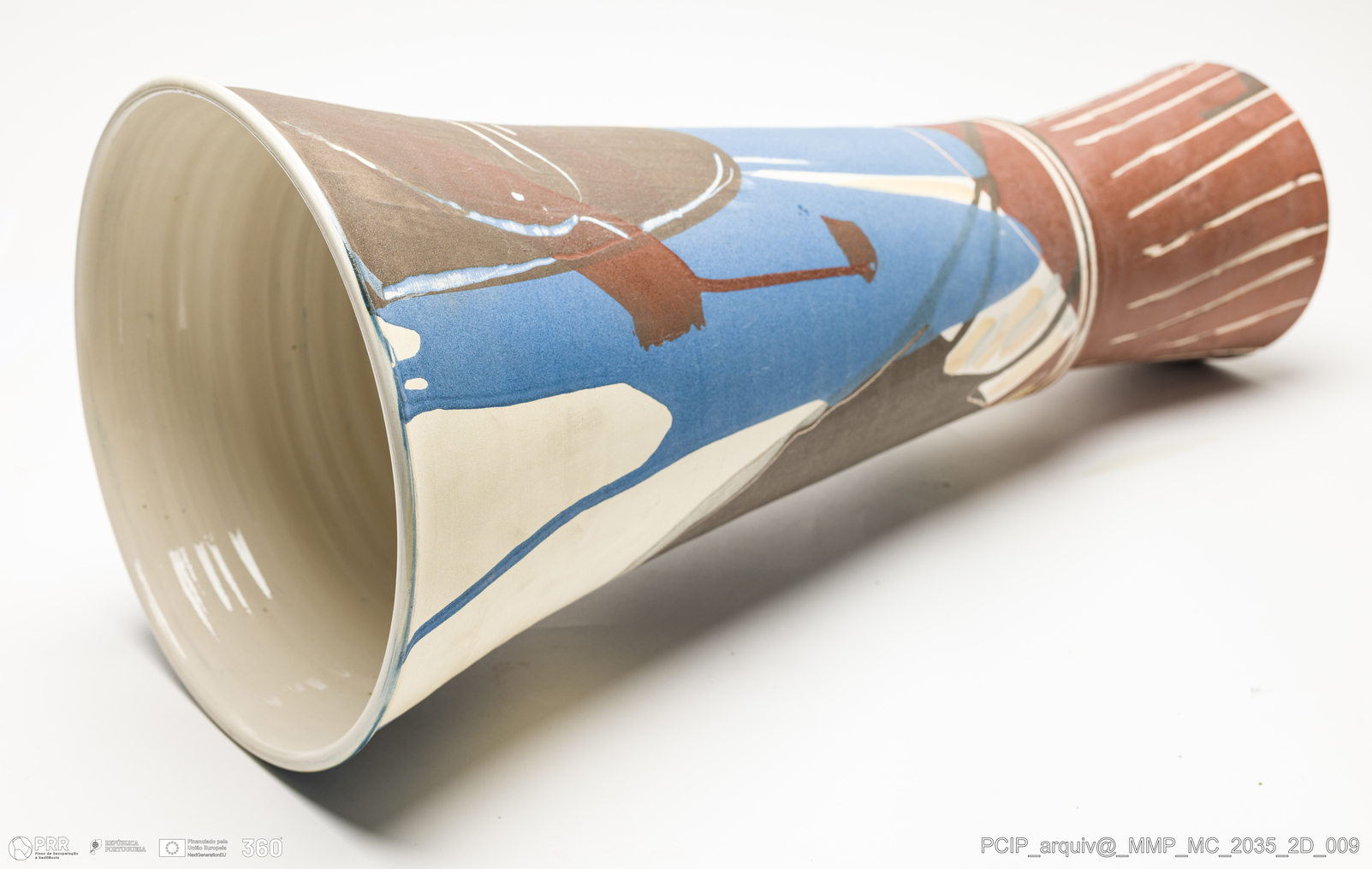 Matéria/Técnica: Barbotina rodada e moldada. Vidrado azul, branco, castanho e preto. Camurça no interior; Cronologia: 1988; Autoria: Eduardo Constantino / Atelier de Ceramique de Eduardo Constantino, Quimperlè, Bretanha, França; Dimensões (cm): Altura: 585; Diâmetro:26.