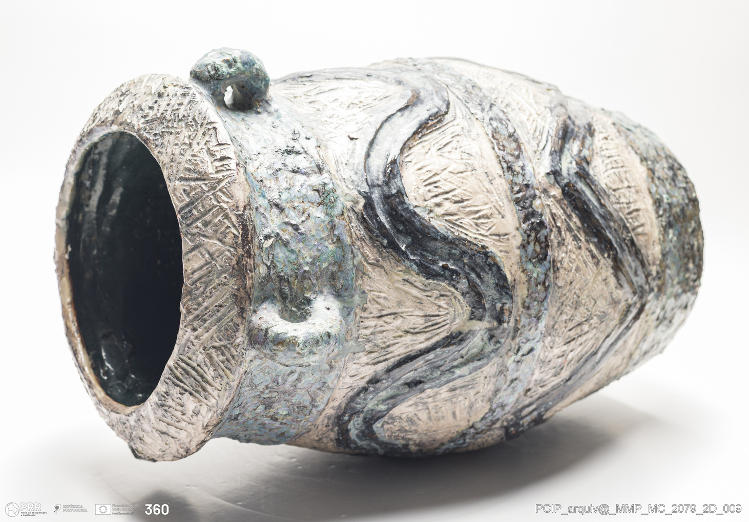 Matéria/Técnica: Grés rodado e moldado. Vidrado polícromo: verde preto e beje; Cronologia: século XX; Autoria: Maria Luisa Fragoso / Oficina de Maria Luisa Fragoso, Lisboa, Portugal; Dimensões (cm): Altura: 40; Diâmetro: 26.