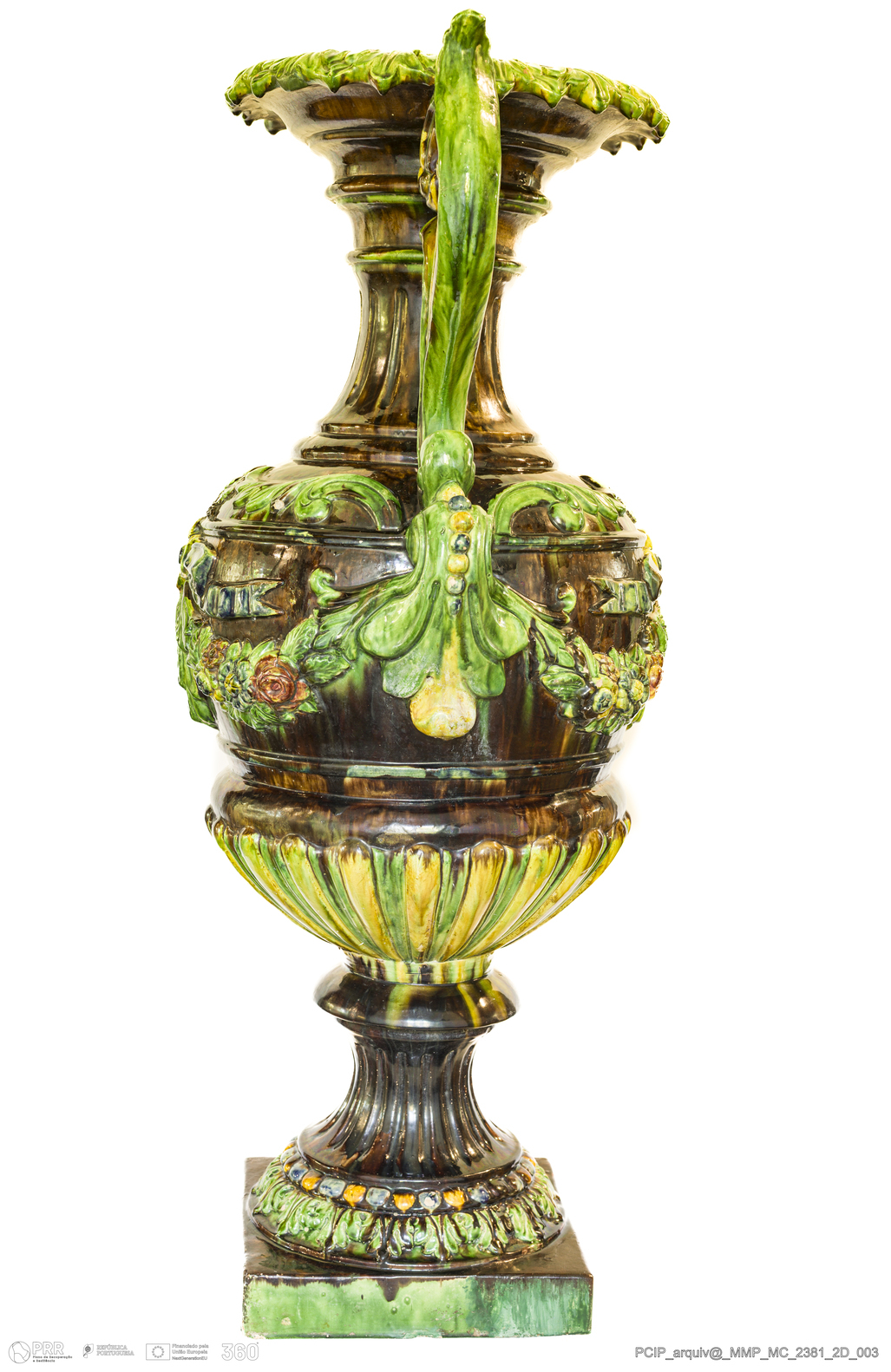 Matéria/Técnica: Barro branco moldado e modelado. Vidrado polícromo: verde, azul, amarelo, vermelho e castanho com escorridos; Cronologia: 1870-1905; Autoria: Manuel Cipriano Gomes Mafra / Fábrica De Manuel Cipriano Gomes O Mafra, Caldas da Rainha, Portugal; Dimensões (cm): Altura: 100; Largura: 42; Comprimento: 52,5.