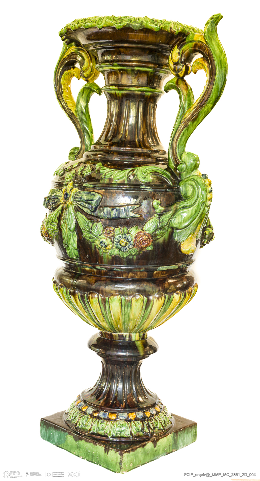 Matéria/Técnica: Barro branco moldado e modelado. Vidrado polícromo: verde, azul, amarelo, vermelho e castanho com escorridos; Cronologia: 1870-1905; Autoria: Manuel Cipriano Gomes Mafra / Fábrica De Manuel Cipriano Gomes O Mafra, Caldas da Rainha, Portugal; Dimensões (cm): Altura: 100; Largura: 42; Comprimento: 52,5.