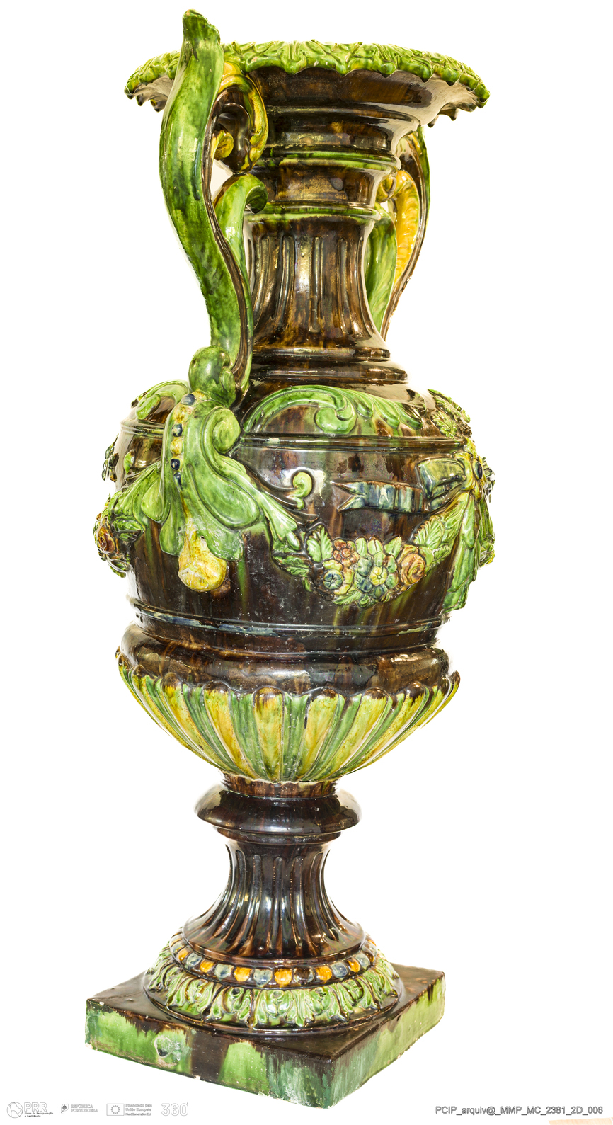 Matéria/Técnica: Barro branco moldado e modelado. Vidrado polícromo: verde, azul, amarelo, vermelho e castanho com escorridos; Cronologia: 1870-1905; Autoria: Manuel Cipriano Gomes Mafra / Fábrica De Manuel Cipriano Gomes O Mafra, Caldas da Rainha, Portugal; Dimensões (cm): Altura: 100; Largura: 42; Comprimento: 52,5.
