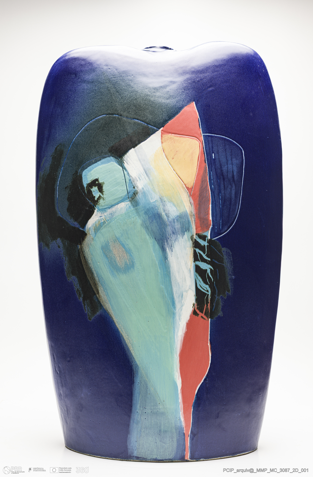 Matéria/Técnica: Grés com engobes vitrificados. Rodado e moldado. Vidrado polícromo em vários tons de azul, laranja amarelo, verde, creme, branco e preto. Discretas linhas incisas sobre fundo azulão; Cronologia: Século XX; Autoria: Eduardo Constantino / Atelier de Ceramique de Eduardo Constantino, Quimperlè, Bretanha, França; Dimensões (cm): Altura: 63; Largura: 37; Comprimento: 20.