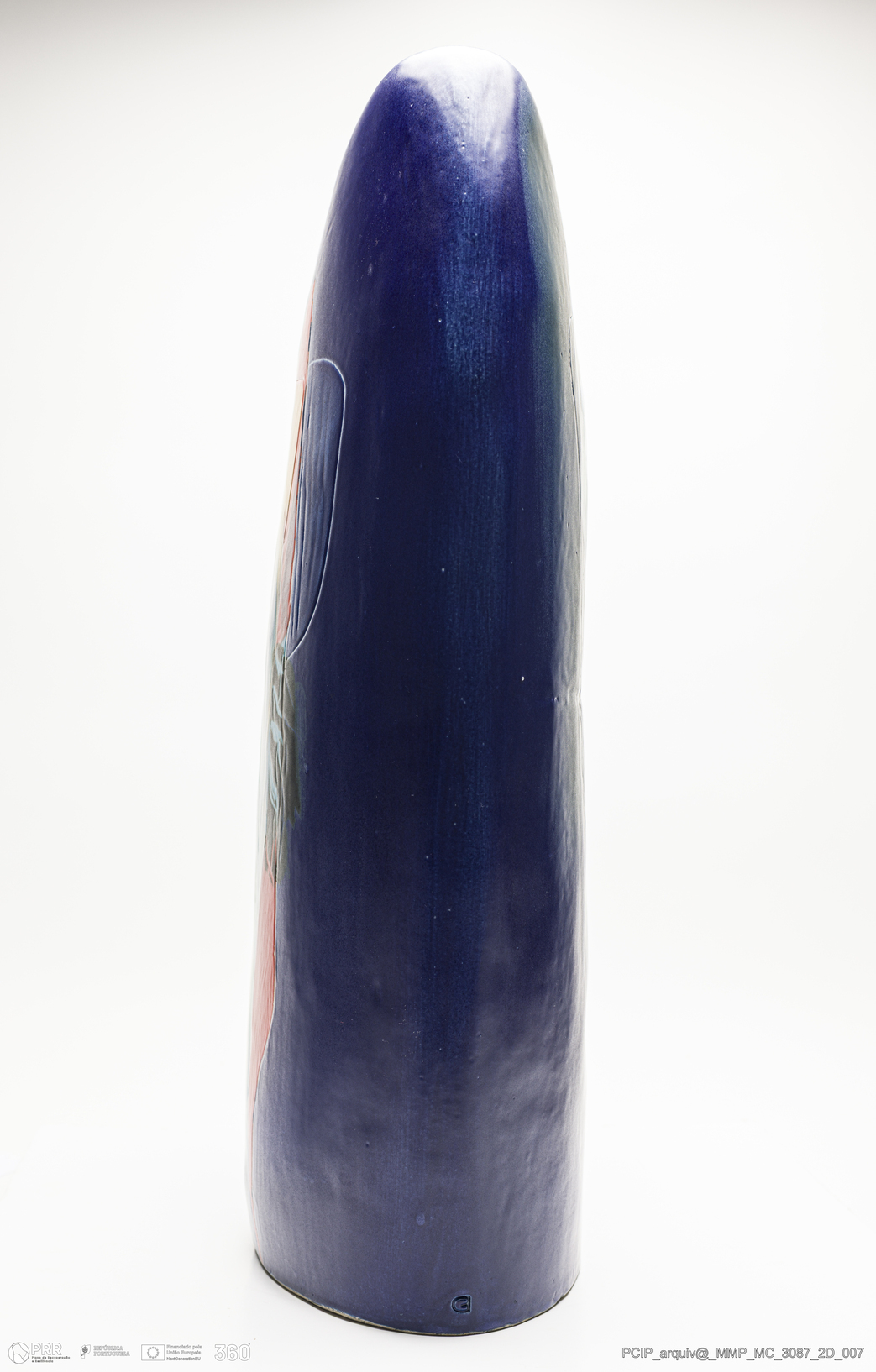 Matéria/Técnica: Grés com engobes vitrificados. Rodado e moldado. Vidrado polícromo em vários tons de azul, laranja amarelo, verde, creme, branco e preto. Discretas linhas incisas sobre fundo azulão; Cronologia: Século XX; Autoria: Eduardo Constantino / Atelier de Ceramique de Eduardo Constantino, Quimperlè, Bretanha, França; Dimensões (cm): Altura: 63; Largura: 37; Comprimento: 20.