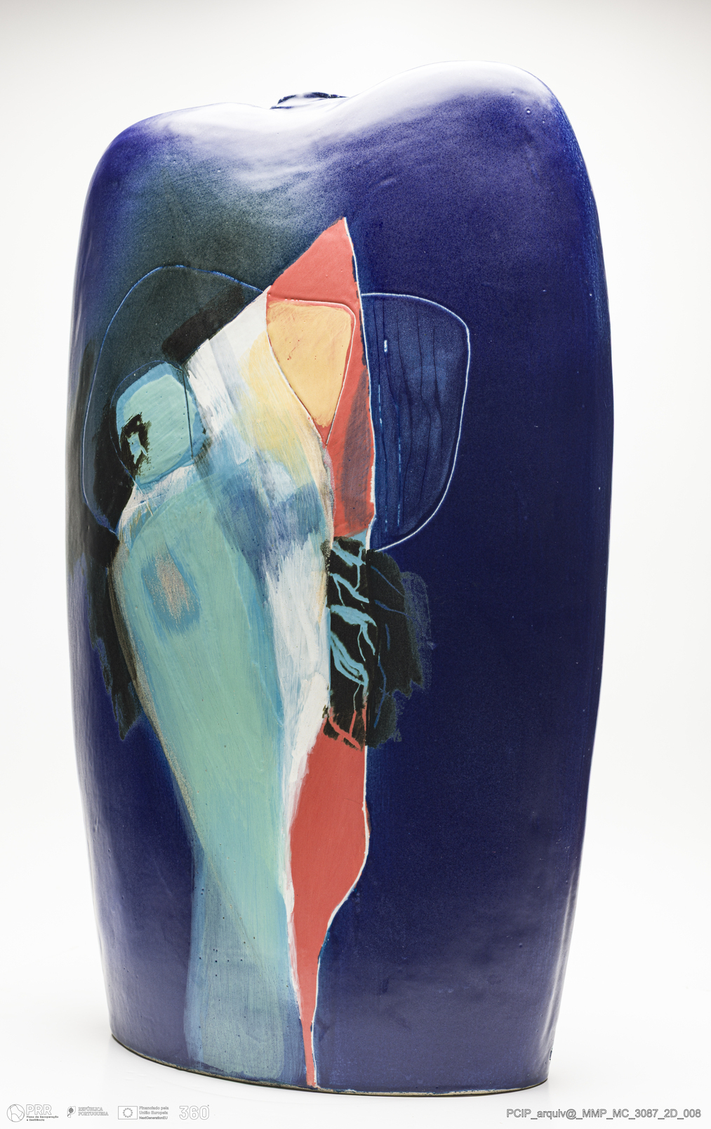 Matéria/Técnica: Grés com engobes vitrificados. Rodado e moldado. Vidrado polícromo em vários tons de azul, laranja amarelo, verde, creme, branco e preto. Discretas linhas incisas sobre fundo azulão; Cronologia: Século XX; Autoria: Eduardo Constantino / Atelier de Ceramique de Eduardo Constantino, Quimperlè, Bretanha, França; Dimensões (cm): Altura: 63; Largura: 37; Comprimento: 20.