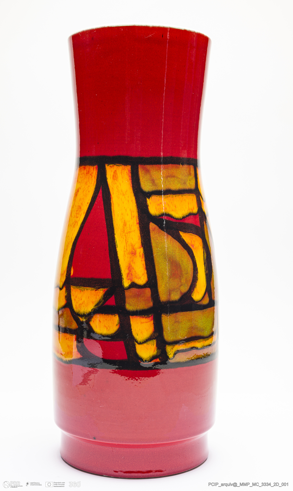 Matéria/Técnica: Barro branco rodado. Vidrado polícromo: preto, vermelho, laranja, amarelo, verde e branco; Cronologia: 1966-1980; Autoria: Tony Morris / Fábrica Poole, Inglaterra; Dimensões (cm): Altura: 39; Diâmetro: 15,5.