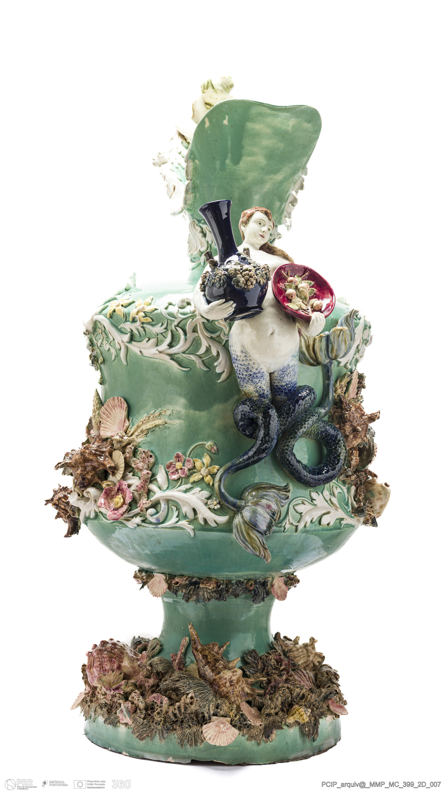 Matéria/Técnica: Barro branco moldado e modelado. Vidrado polícromo: azul, verde, azul cobalto, ocre, rosa e castanho; Cronologia: 1892-1896; Autoria: José Joaquim Pinto da Silva / Atelier Cerâmico, Caldas da Rainha, Portugal; Dimensões (cm): Altura: 98,3; Diâmetro: 37,7.