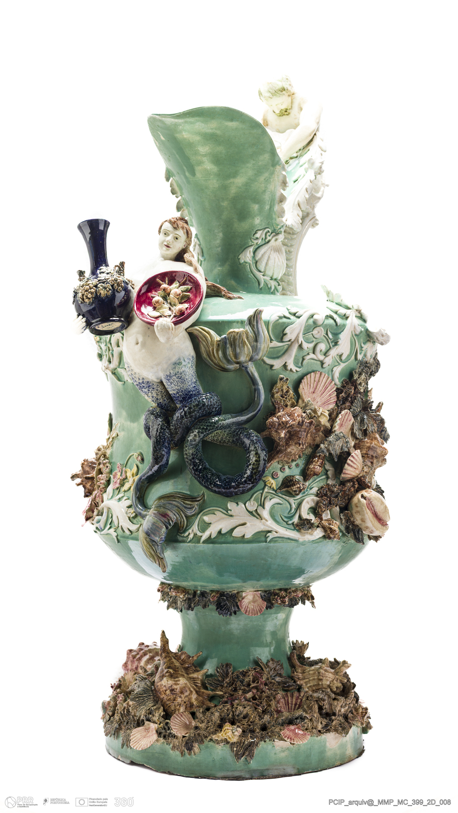 Matéria/Técnica: Barro branco moldado e modelado. Vidrado polícromo: azul, verde, azul cobalto, ocre, rosa e castanho; Cronologia: 1892-1896; Autoria: José Joaquim Pinto da Silva / Atelier Cerâmico, Caldas da Rainha, Portugal; Dimensões (cm): Altura: 98,3; Diâmetro: 37,7.