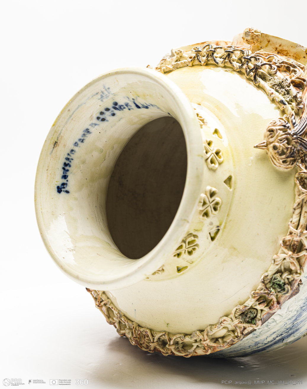 Matéria/Técnica: Barro branco rodado e modeladoVidrado polícromo: camurça, castanho e branco; Cronologia: 1892; Autoria: Rafael Bordalo Pinheiro e José Carlos dos Santos / Fábrica de Faianças das Caldas da Rainha, Portugal; Dimensões (cm): Altura: 30,9; Largura: 27,5.