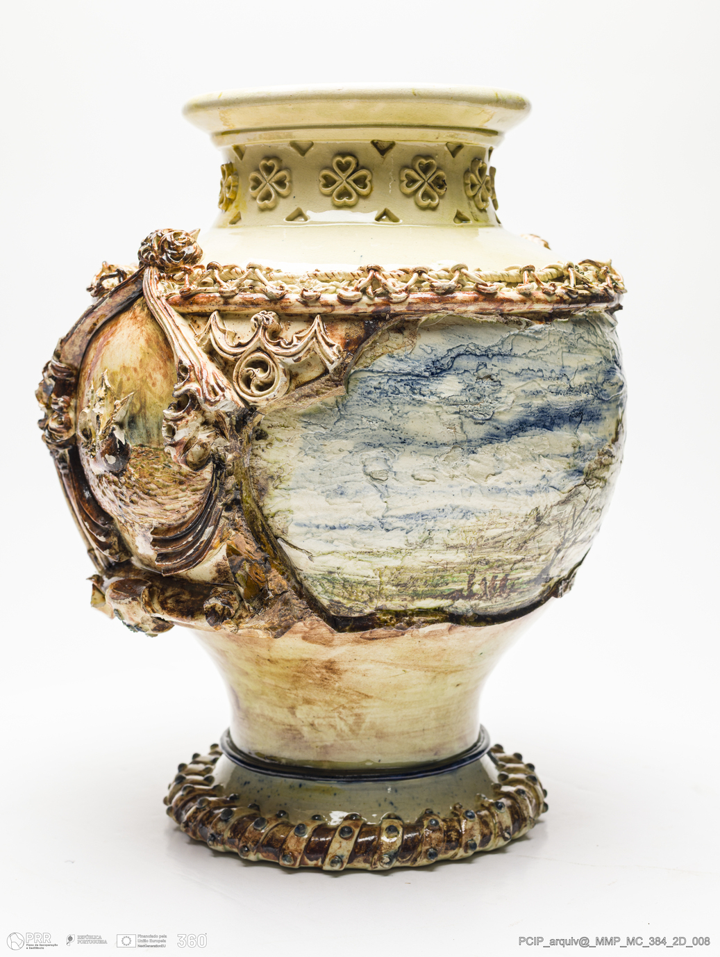 Matéria/Técnica: Barro branco rodado e modeladoVidrado polícromo: camurça, castanho e branco; Cronologia: 1892; Autoria: Rafael Bordalo Pinheiro e José Carlos dos Santos / Fábrica de Faianças das Caldas da Rainha, Portugal; Dimensões (cm): Altura: 30,9; Largura: 27,5.