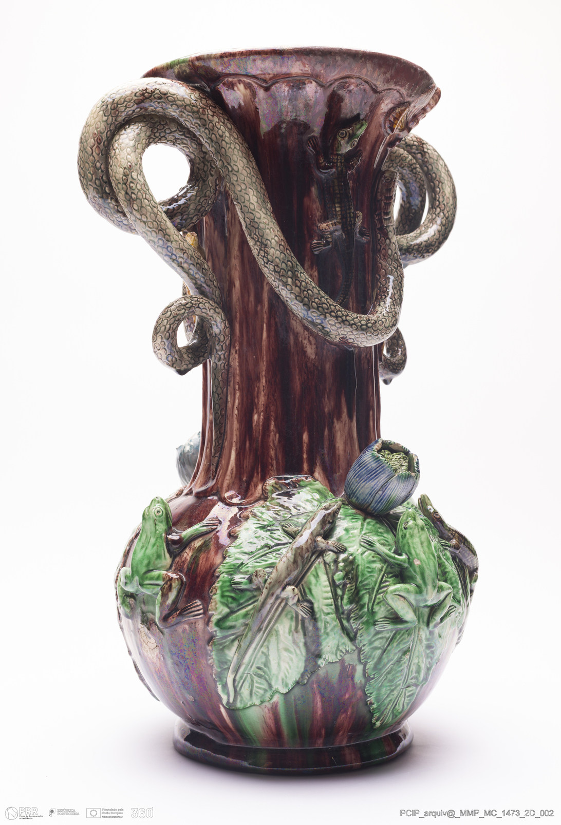 Matéria/Técnica: Barro branco moldado e modelado. Vidrado polícromo: castanho escuro e mel, verde, azul e amarelo; Cronologia: 1870-1887; Autoria: Manuel Cipriano Gomes Mafra / Fábrica De Manuel Cipriano Gomes O Mafra, Caldas da Rainha, Portugal; Dimensões (cm): Altura: 41; Largura: 35,5; Comprimento: 29.
