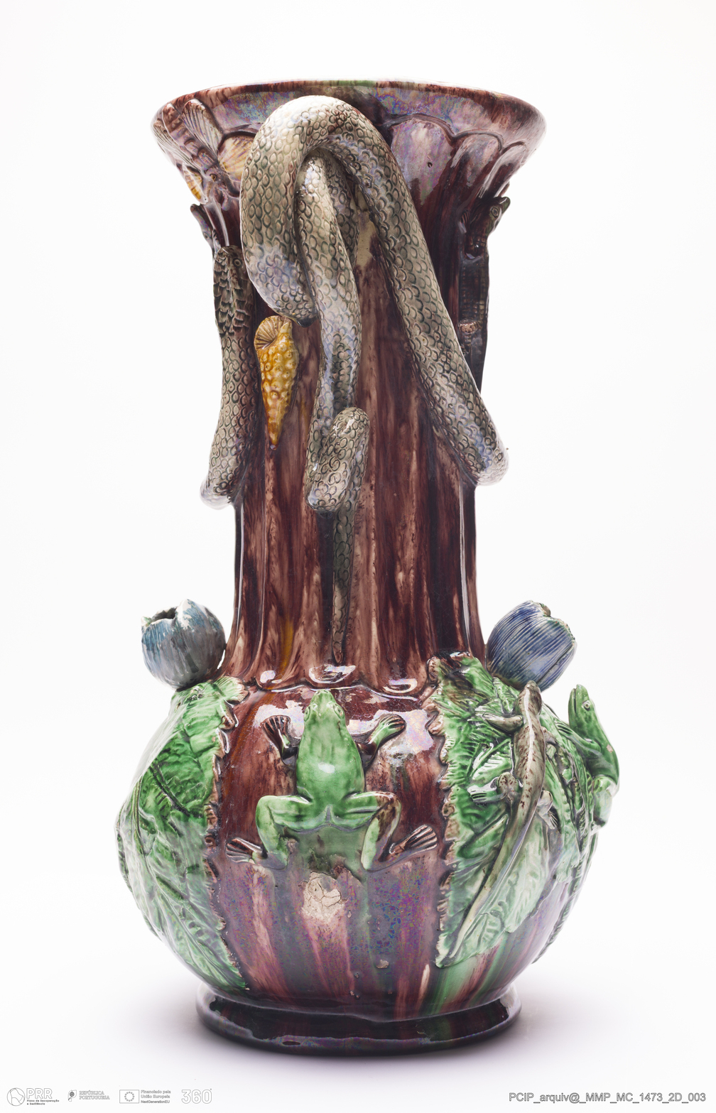 Matéria/Técnica: Barro branco moldado e modelado. Vidrado polícromo: castanho escuro e mel, verde, azul e amarelo; Cronologia: 1870-1887; Autoria: Manuel Cipriano Gomes Mafra / Fábrica De Manuel Cipriano Gomes O Mafra, Caldas da Rainha, Portugal; Dimensões (cm): Altura: 41; Largura: 35,5; Comprimento: 29.